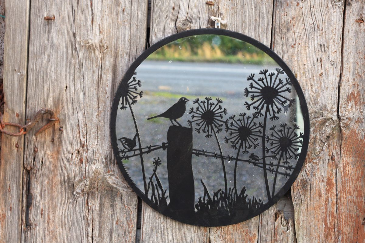 Blackbird on fence 70cm mirrored wall art in black powder coated finish